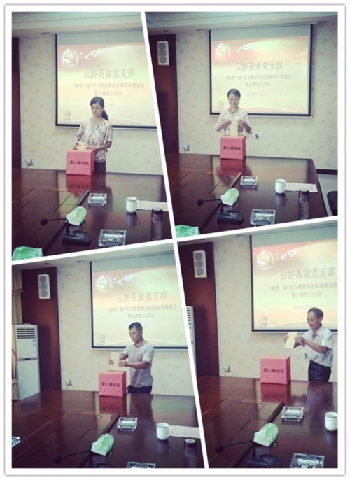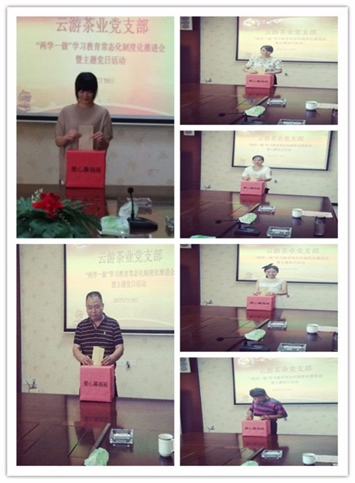 2017年7月19日,云游茶業黨支部召開“兩學一做”學習教育常態化制度化推進會及主題黨日活動,向災區人民愛心募捐作為會議的一項重要議程進行。在公司董事長楊正武、黨支部書記楊應輝的指導下,黨員們積極參與、慷慨解囊,共募集愛心款1萬元,全部轉賬給長沙市望城區雷鋒慈善會,用于災區人民災后重建工作。